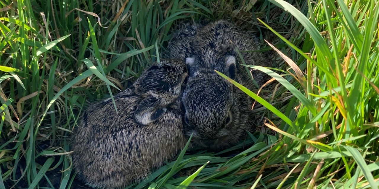 Het 'tilt op' van de hazen, waarvan veel al jongen hebben. Rond de paasdagen kwamen we dit nestje tegen. Vertrouwend op hun schutkleur blijven de haasjes tot het laatst toe roerloos liggen.